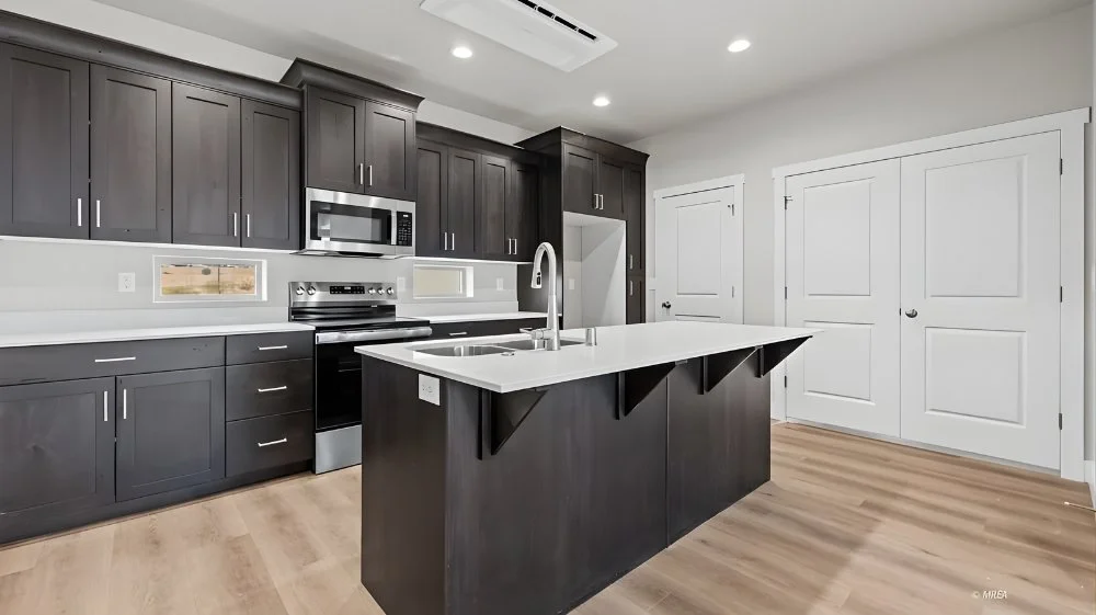 Stylish Shiitake cabinets paired with a Knotty Alder Chestnut bar and Frost Quartz countertops bring warmth and natural charm to your home.