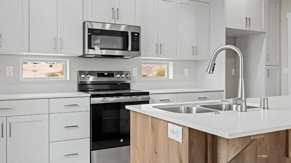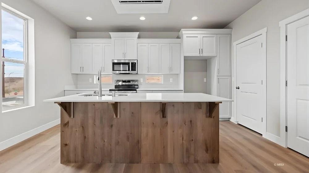 Elegant Eider White cabinets with a matching painted bar and Frost Quartz countertops create a fresh, airy atmosphere perfect for modern living.